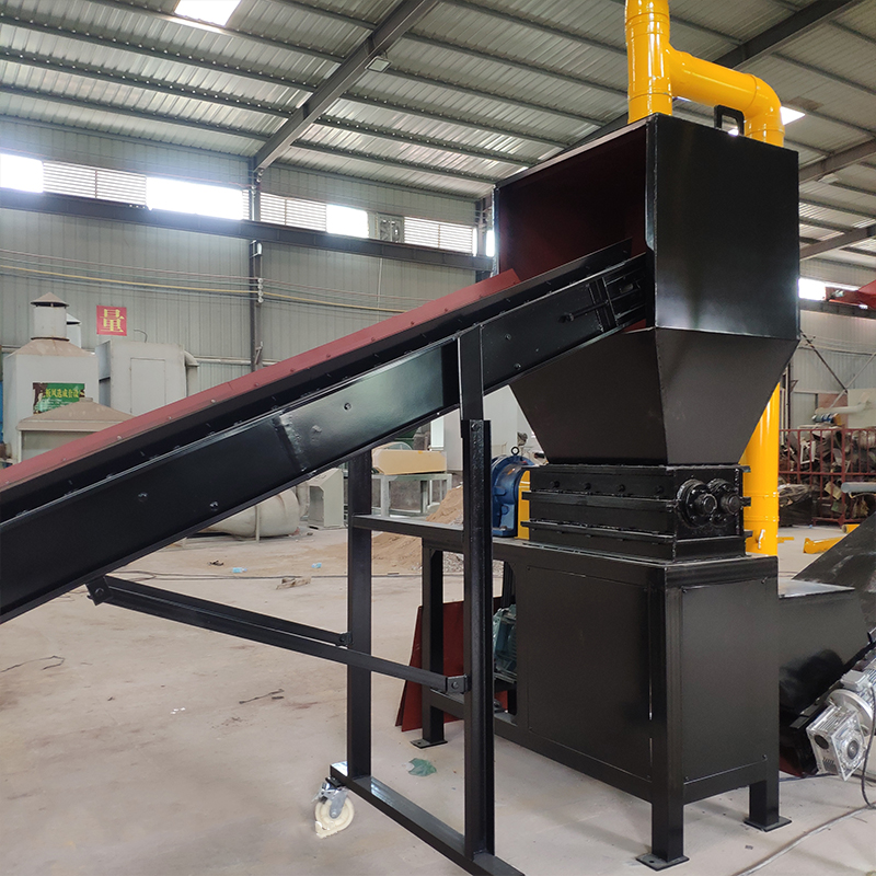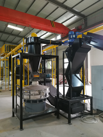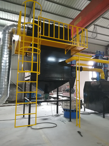 由輸送機將物料送入一級破碎機中進行粗破碎,粗破碎后的物料再通過輸送機送入二級破碎機中進行第二次破碎,二級破碎機破碎后的物料進入到輸送機中同時設置磁選設備,可以將物料中的鐵分選出來。物料輸送機和磁選器去除鐵后,進入到三級破碎機中進行細破碎,將物料破碎至粉末。粉末狀態的物料由負壓系統進入到旋風分離器中進行空氣過濾,并通過風機落至氣流分選機上,由氣流分選機分選,使不同密度的物質進行分層,最后得到金屬分選出來,而所有的非金屬由負壓系統帶入脈沖除塵器進行集中。而過濾得到的尾氣將繼續由負壓系統送入到尾氣處理設備中進行空氣凈化,使之達到國家排放標準后再進行高空排放。