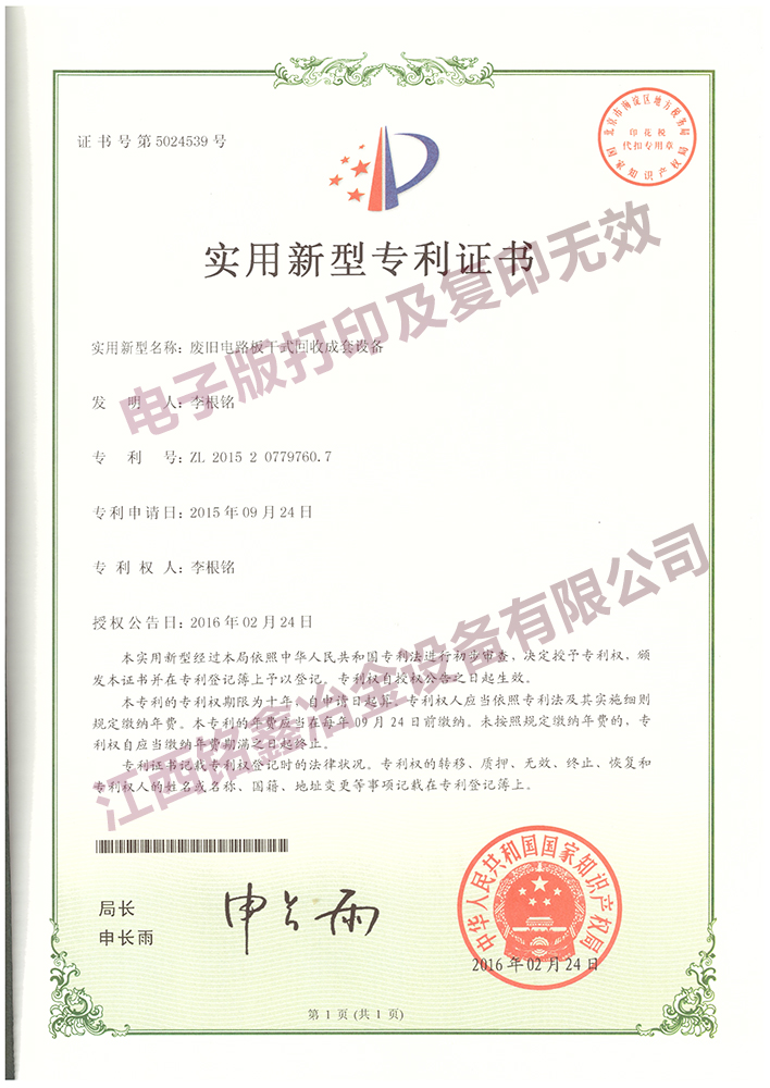 • 廢舊電路板干式回收成套設備- ZL20150779760.7