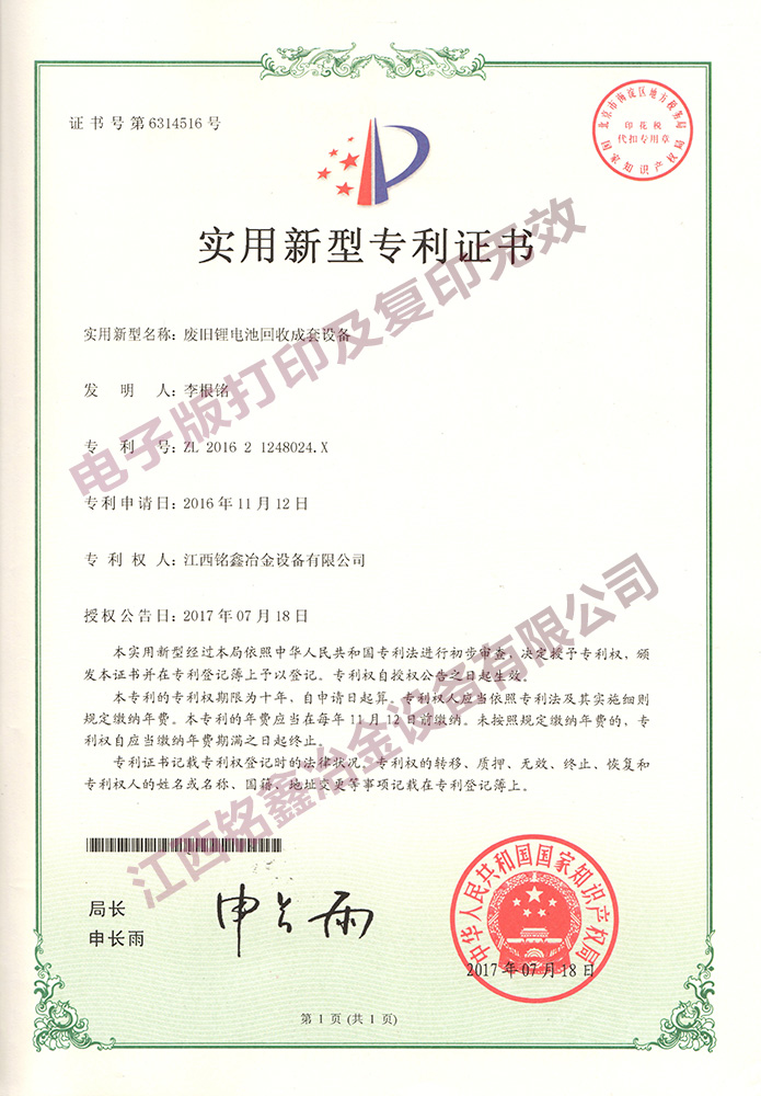• 廢舊鋰電池回收成套設備-ZL201621248024.X