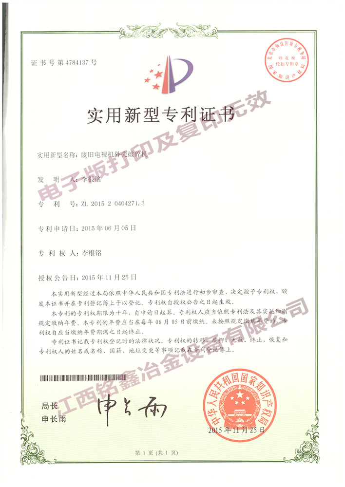 • 廢舊電視機外殼破碎機- ZL201520404271.3