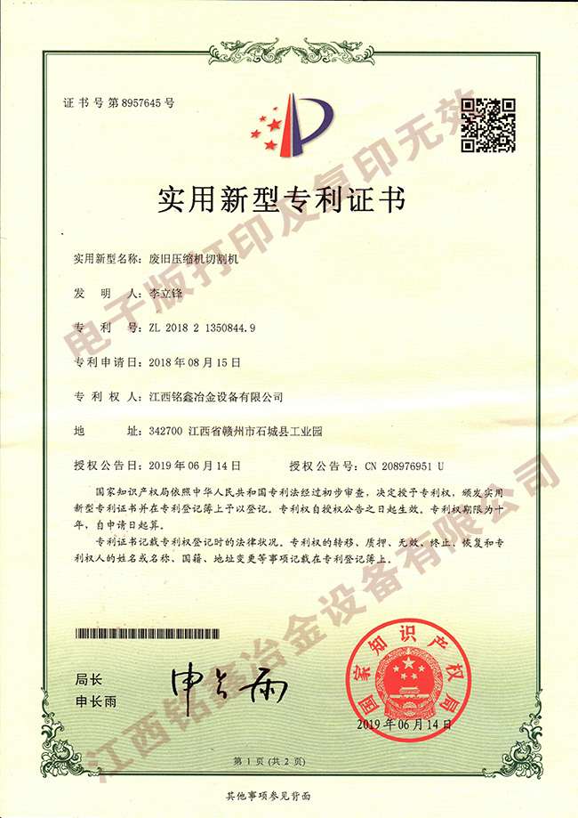 • 廢舊壓縮機切割機-ZL201821350844.9